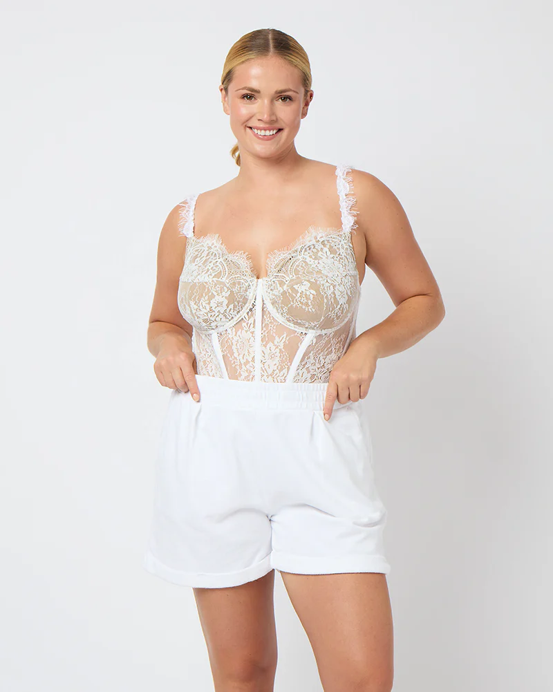 An underwire corset bodysuit specifically made for larger cup sizes from D to M cups. To tuck or not to tuck? Finding the perfect length can be tricky so we made it a bodysuit! Lace and power mesh combo with a back zip and our signature cheeky panty with a 3-snap gusset. Available in Black and White. Hand sewn by corset specialists in Brooklyn, NY.